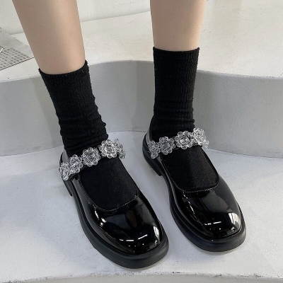 Crystal Flowers Shoes Black Leather Lolita Shoes